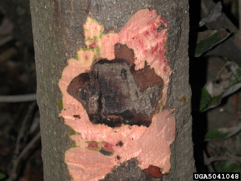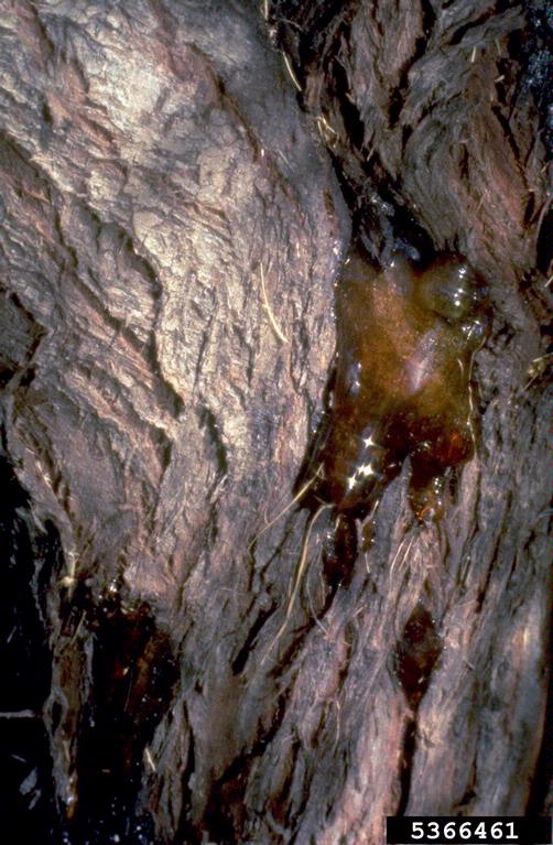 Phytophthora species, including P. ramorum, cause bleeding stem cankers of several tree hosts. These cankers interfere with water transport and may cause crown wilting or dieback. Symptoms of Phytophthora cankers include bleeding of a reddish-brown to black gummy liquid from the lesion area and brown or pink staining of the inner bark and cambium with a defined margin. If a tree has these symptoms a sample should be collected and submitted for analysis to determine if the causal organism is P. ramorum or some other Phytophthora species.
